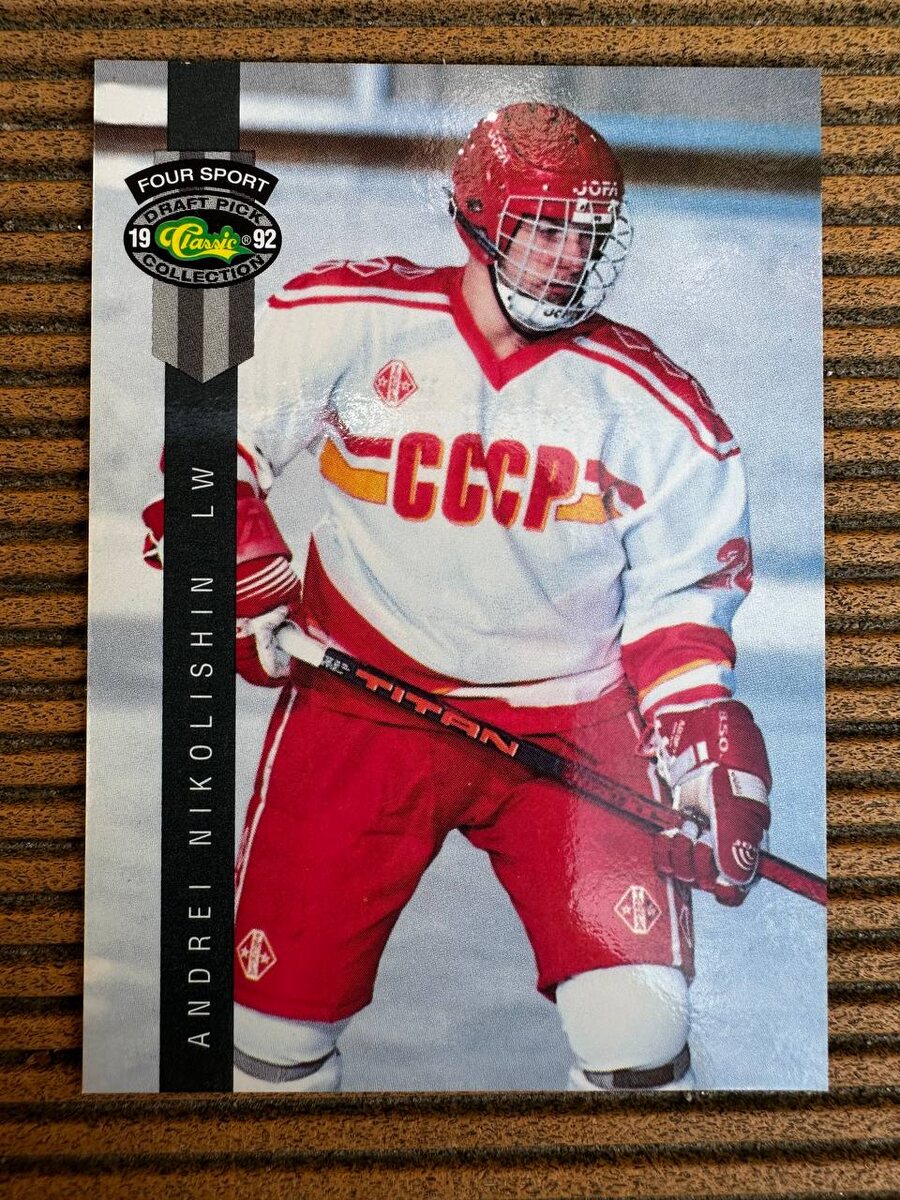 Андрей Николишин 🏒 На этой карте — не просто хоккеист. На ней — прощание с эпохой. 🎴 Classic Four Sport Draft Pick Collection 1992, карта №189. Молодой Андрей Николишин в форме сборной СССР — та самая бело-красная, с «СССР» на груди и шлемом Jofa. Легендарный стиль. Последний вздох великой машины. 📅 Год 1992. СССР уже распался. Но карточка всё ещё дышит тем воздухом — дисциплина, скорость, цель. Николишину всего 19. Он уже в «Динамо», уже на виду, и его только что выбрал «Хартфорд» под №47. 🧊 Статистика ещё скромная — 18 матчей, 1 гол, 1 передача. Но главное — не цифры. Главное — момент. Это одна из первых карт новой волны. Волны, где россияне поехали в НХЛ и начали менять игру. ⚡️ В описании — его называют «известным за взрывную скорость». И это правда. Николишин стал надёжным игроком в НХЛ, но эта карта — не про результат. Она — про старт. Про юность. Про CCCP, которого больше нет. А хоккей еще как есть!!! Я вот тоже успел поиграть точно в такой же JOFA и Titan 4020 😍 А как