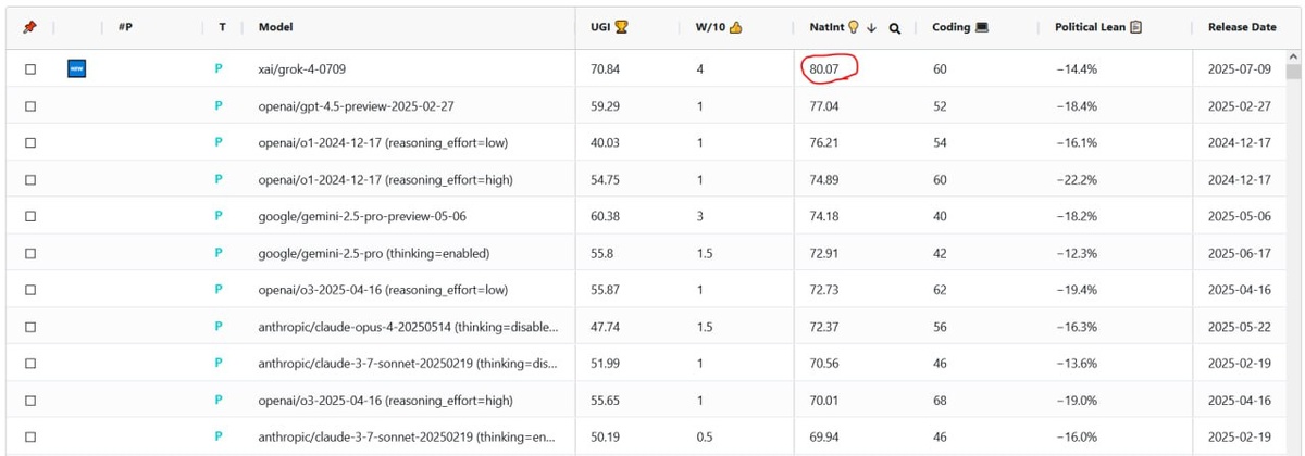 Вышел новый Grok 4 и смотрите-ка - он в топе по тесту UGI, который показывают, насколько модель гибкая и не зашоренная. Да и по другим тестам он тоже лучший...
