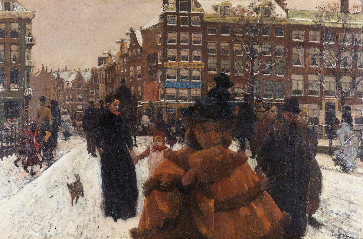 Георг Хендрик Брейтнер (1857-1923) называл себя народным художником. Его главной темой была повседневная городская жизнь, которую он фиксировал в набросках, картинах и фотографиях – новом для того времени формате. Виртуозное мастерство Брейтнера в обращении с кистью и краской проявляется в изображении женщины, приподнимающей юбку. Художник изобразил её платье и красный шарф или воротник с помощью taches – термина, означающего свободные мазки краски, нанесённые рядом друг с другом. Эта стремительная, "импрессионистская" техника была введена в Нидерландах художниками Гаагской школы, начиная с 1860 года. Молодые амстердамские художники, включая Брейтнера, переняли этот новый стиль примерно в 1890 году. Для Брейтнера Амстердам был неиссякаемым источником вдохновения: характерные фасады, каналы, лошади, повозки, лодки и люди. Палейсстраат, расположенный за Королевским дворцом на площади Дам, был и остаётся оживлённой улицей с магазинами и кафе. Женщина на переднем плане выглядит так, будт