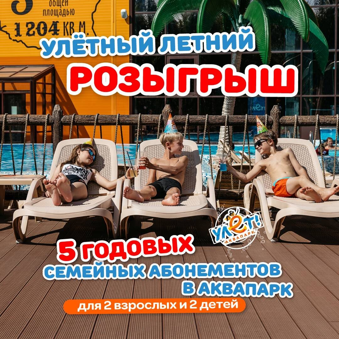 Улётный розыгрыш в нашей группе в ВК по случаю открытия летней террасы🎉 ✨Испытайте свою удачу✨ 🎁Всего 5 призов - 5 годовых семейных абонементов для 2 взрослых и 2 детей в аквапарк🥳 👉Участвовать👈