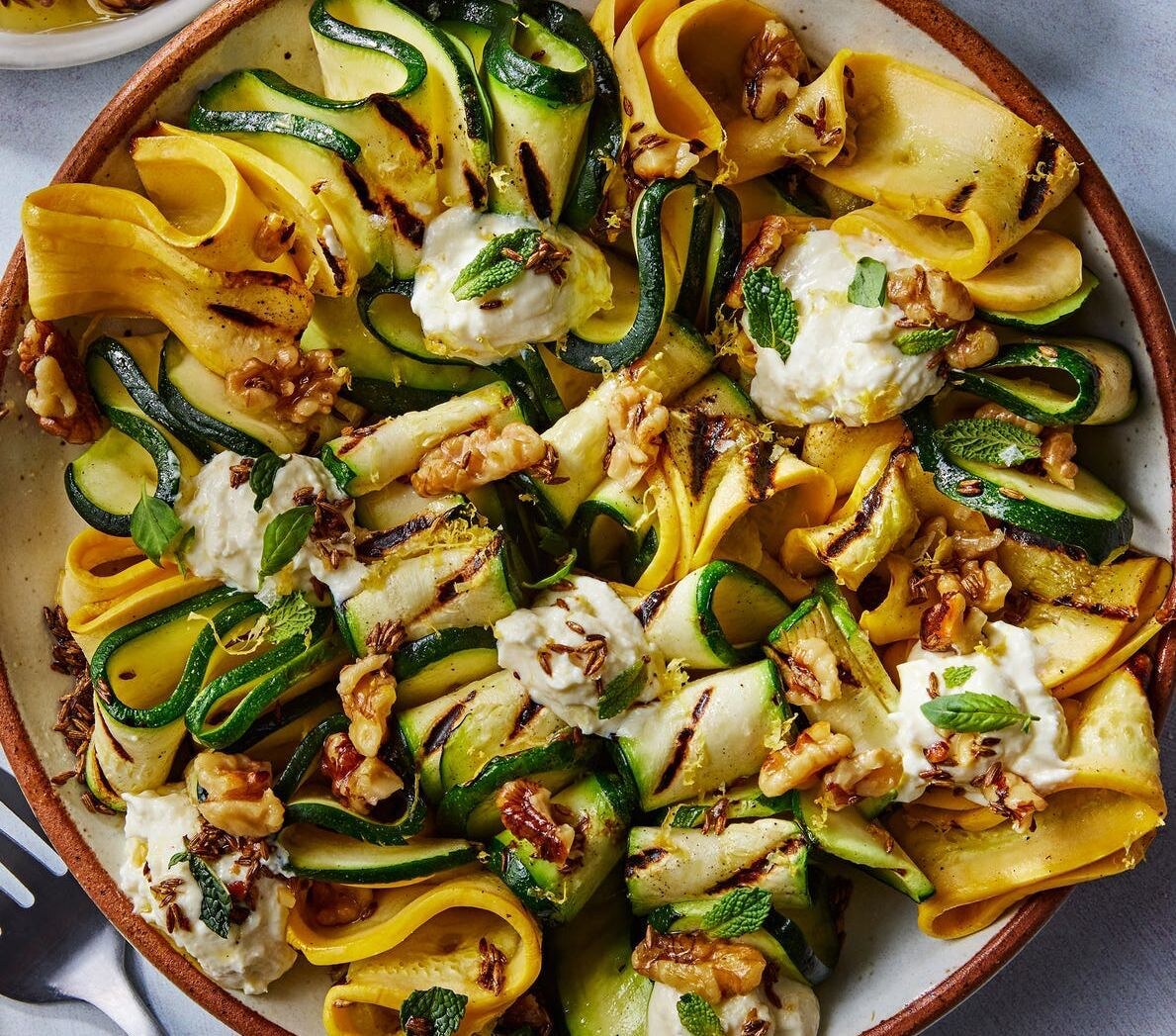 #соль_гриль Салат из жареных кабачков Тут, собственно, главное ноухау – жарить кабачки не кружками на решетке, как обычно делают, а нарезать их вдоль лентами, нанизать гармошкой на шампур и так пожарить. Контакта с грилем будет меньше, будет больше контраста текстур. Ну и, наконец, это красиво. 3-4 больших разноцветных кабачка 1 зубчик чеснока 2 ст.л. лимонного сока Цедра 1 лимона 150 г рикотты Горсть грецких орехов Пучок зеленого базилика Пучок мяты Оливковое масло Соль, черный перец Кабачки порежьте полосками и замаринуйте в смеси оливкового масла, лимонного сока, лимонной цедры, соли и мелко порезанного чеснока, минут на 20. Пожарьте кабачки на гриле, по 3-4 минут с каждой стороны. Переложите в миску, сняв с шампуров. Обжарьте грецкие орехи на сковородке без масла (можно там же на гриле), порубите крупно и добавьте к кабачкам. Туда же рикотту и порубленную зелень. Посолите-поперчите и заправьте оливковым маслом. Параллельно можно пару цыплят пожарить на решетке, отличная будет