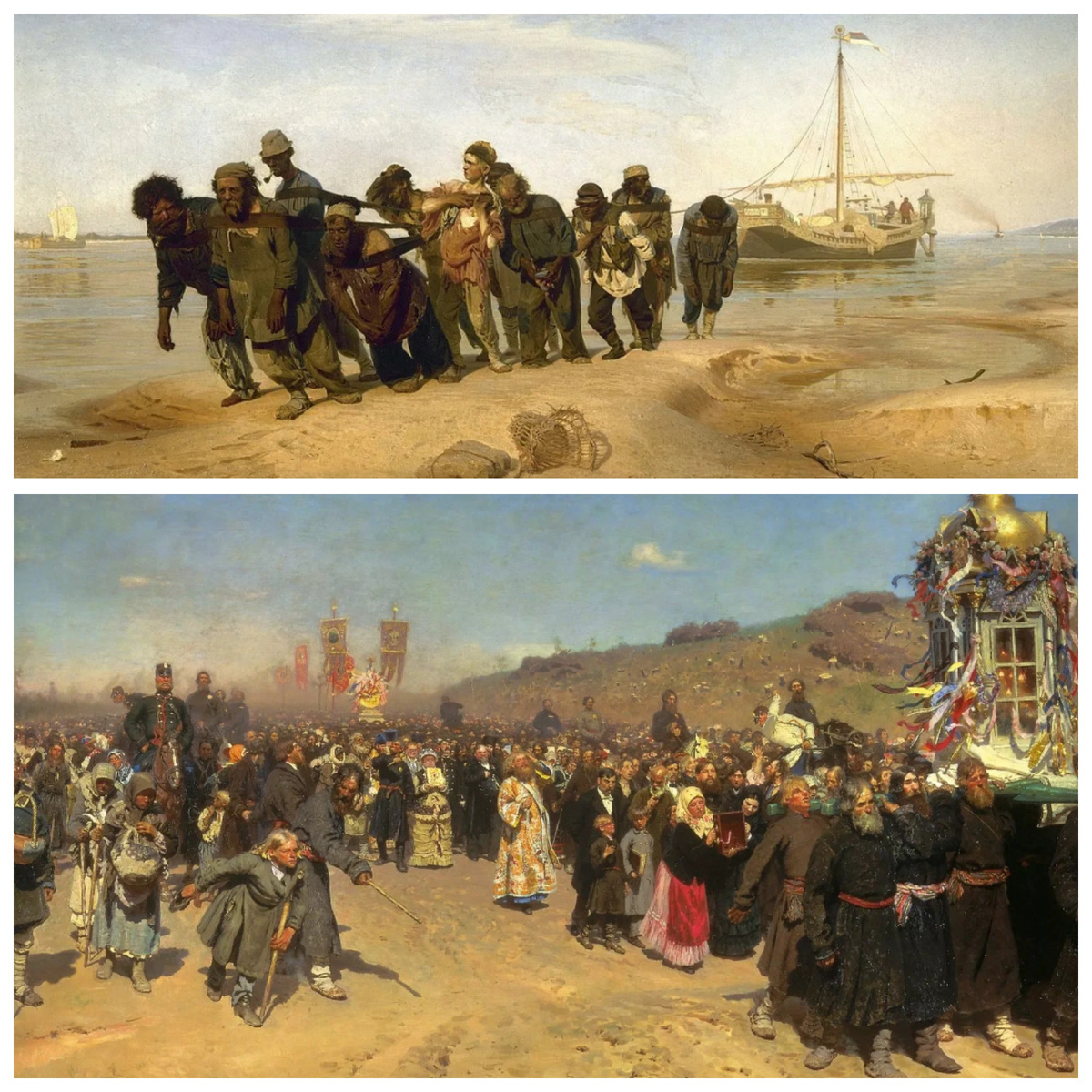Бурлаки на Волге. Бурлаки считаются одним из первых произведений русского реализма, отражающих жизнь простых людей, символом тяжелого труда народной силы. На Всемирной выставке 1873 года в Вене картина завоевала бронзовую медаль. Крестный ход в Курской губернии. В картине Репин мастерски показывает контраст между богатыми и бедными, представителями власти и простым народом.