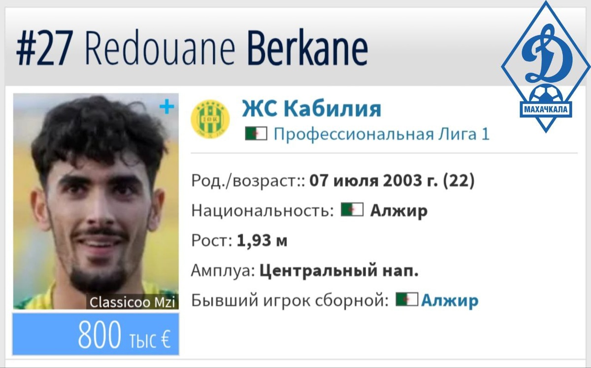 ⚡️🇩🇿 Махачкалинское «Динамо» ведет переговоры с «Кабилией» по покупке форварда Редуана Беркана