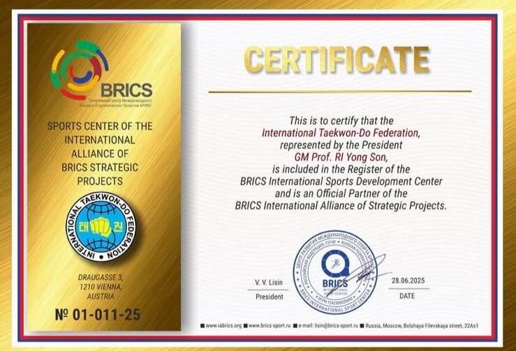 В год 70-летия Международной Федерации Taekwon-Do она достигла знаменательного события: была официально признана и включена в программу Игр БРИКС! Это поистине историческое решение стало результатом тесного сотрудничества между ITF и спортивным ведомством стран БРИКС. С нетерпением ожидаем дебют Taekwon-Do ITF на Играх БРИКС, который состоится в 2026 году!