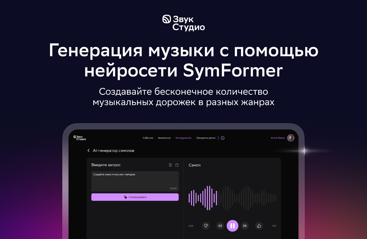 ΠΠ²ΡΠΊ Π‘ΡΡΠ΄ΠΈΠΎ ΡΡΠ°Π» ΠΏΠ΅ΡΠ²ΡΠΌ ΡΠΎΡΡΠΈΠΉΡΠΊΠΈΠΌ ΡΠ΅ΡΠ²ΠΈΡΠΎΠΌ Π΄Π»Ρ Π°ΡΡΠΈΡΡΠΎΠ², Π² ΠΊΠΎΡΠΎΡΠΎΠΌ ΠΏΠΎΡΠ²ΠΈΠ»ΡΡ Π³Π΅Π½Π΅ΡΠ°ΡΠΈΠ²Π½ΡΠΉ ΠΠ Π΄Π»Ρ ΡΠΎΠ·Π΄Π°Π½ΠΈΡ ΠΌΡΠ·ΡΠΊΠΈ. Π’Π΅ΠΏΠ΅ΡΡ ΠΌΡΠ·ΡΠΊΠ°Π½ΡΡ ΠΌΠΎΠ³ΡΡ Π³Π΅Π½Π΅ΡΠΈΡΠΎΠ²Π°ΡΡ ΡΠ΅ΠΌΠΏΠ»Ρ ΠΈ ΡΠ΅Π»ΡΠ΅ Π΄ΠΎΡΠΎΠΆΠΊΠΈ ΠΏΠΎ ΡΠ΅ΠΊΡΡΠΎΠ²ΠΎΠΌΡ Π·Π°ΠΏΡΠΎΡΡ Ρ ΠΏΠΎΠΌΠΎΡΡΡ Π½Π΅ΠΉΡΠΎΡΠ΅ΡΠΈ SymFormer ΠΎΡ Π‘Π±Π΅ΡΠ°. ΠΠΎΠ²Π°Ρ ΡΡΠ½ΠΊΡΠΈΡ ΠΏΡΠΈΠ·Π²Π°Π½Π° ΠΏΠΎΠΌΠΎΡΡ Π°ΡΡΠΈΡΡΠ°ΠΌ ΡΠΊΠΎΠ½ΠΎΠΌΠΈΡΡ Π²ΡΠ΅ΠΌΡ ΠΈ ΡΡΠ΅Π΄ΡΡΠ²Π° Π½Π° ΠΏΡΠΎΠ΄Π°ΠΊΡΠ΅Π½, Π° ΡΠ°ΠΊΠΆΠ΅ Π±ΡΡΡΡΠ΅Π΅ Π½Π°Ρ