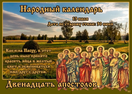 В воскресенье 13 июля 2025 года в народном календаре – Полупётр, Макушка лета, поминки по весне, проводы весны, Двенадцать апостолов. Крестьяне отмечали Макушку лета, провожали весну. Православная церковь 13 июля празднует Собор двенадцати апостолов и вспоминает преподобного Петра, царевича Ордынского (Ростовского). ❇️ПРИМЕТЫ ✔️Если кукушка продолжает куковать, то лето будет долгое и теплое. ✔️После дождя лещ из воды высовывает голову – к теплому вечеру. ✔️С этого дня лето катится зиме навстречу. ✔️Облака желтые как медь – к дождю. ✔️Белые облака против ветра поднимаются – к дождю, по ветру идут – к теплу. ✔️Утром выпала роса – к солнечной погоде, нет росы – жди осадков. ✔️День убывает – жара прибывает. ❌ЧТО НЕЛЬЗЯ ДЕЛАТЬ ✔️В праздник Макушки лета 13 июля нельзя делать яичницу, иначе в бедности целый год проживешь. ✔️Запрещено сидеть дома, не выходя на улицу. Надо в этот день хотя бы 15 минут побыть на природе, поблагодарив ее за то, что она дарит тепло и солнечную погоду. ✔️Не с