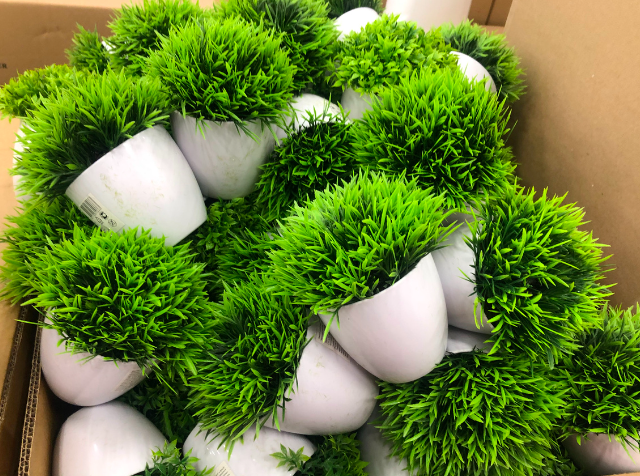 Имитация густой зелёной травы. Компактный размер, подходит для полок, столов, подоконников. Горшок выполнен из белого пластика, округлой формы