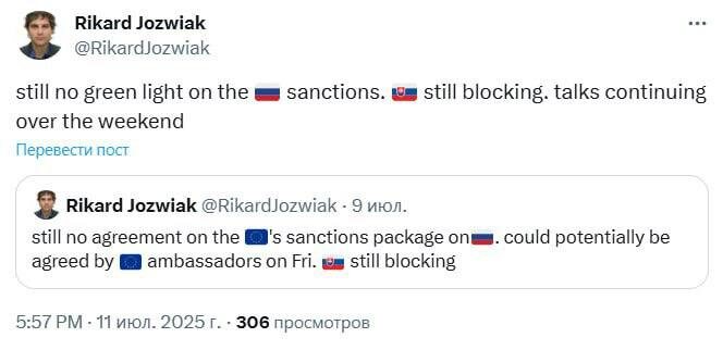 Словакия продолжает блокировать 18-й пакет санкций против России, сообщает корреспондент «Радио Свобода» По словам Рикарда Йозвяка, переговоры продолжатся в минувшие выходные. Сальное Дифлопэ