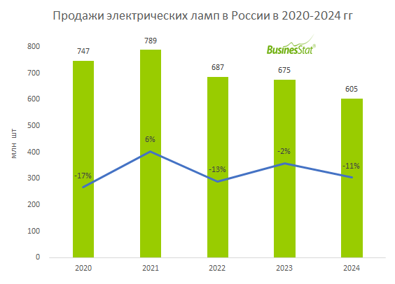 За 2020-2024 гг продажи электрических ламп всех типов в России снизились на 19%: с 747 до 605 млн шт.