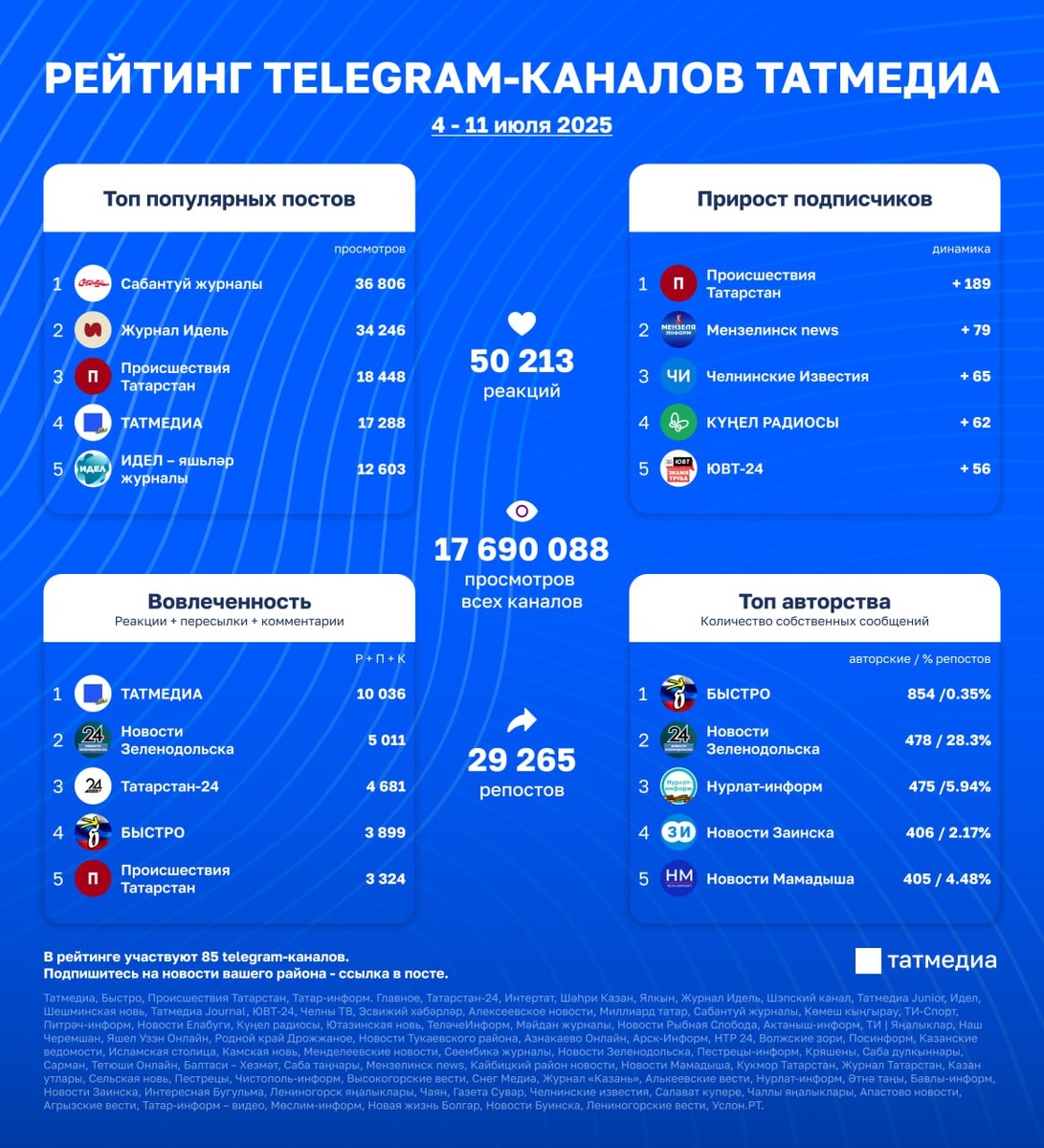 В ответ на пост 📊📱 Обновлённый рейтинг каналов Татмедиа | 4 июля –11 июля Каналы с наибольшим числом просмотров: 1. ТАТМЕДИА - 2 290 019 2. Новости Зеленодольска - 1 209 360 3. БЫСТРО - 913 704 4. Татарстан-24 - 802 676 5. Интертат - 752 751 Посты с наибольшим числом просмотров: 36 806 🔹 Сабантуй журналы: «Сабантуйлы балачак»! 10 июль | 12.00 | Фестиваль бульвары. 34 246 🔹 Журнал Идель: Нурминский организует мото-Сабантуй в Балтасях. 18 448 🔹 Происшествия Татарстан: Жителям Альметьевска разрешили покинуть укрытия. 17 288 🔹 ТАТМЕДИА: Коррупция разрушает жизни семей. Этого можно избежать, если жить законно. 12 603 🔹 ИДЕЛ – яшьләр журналы: «Мондый чараның әле булганы юк» — Нурминский Балтачта мотофестиваль оештыра. 10 550 🔹 Татар-информ. Главное: Раис Татарстана Рустам Минниханов работает на площадке «Екатеринбург-ЭКСПО», где проходит Международная промышленная выставка ИННОПРОМ. 8 372 🔹 Шәһри Казан: Әтнә районында янгын: “Урамга килеп керсәк – йорт урынында кара өем ге