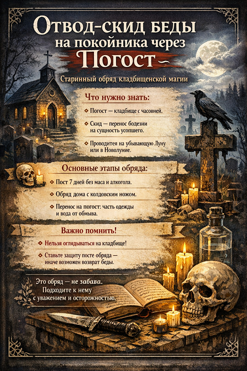 Я рассказала вам о старинном обряде скида болезни через погост — не для того, чтобы кого-то напугать или, наоборот, вдохновить на необдуманные действия. Мне важно, чтобы вы понимали, как устроен этот пласт магической традиции. Знание — это всегда свобода. Свобода выбора, свобода решения.