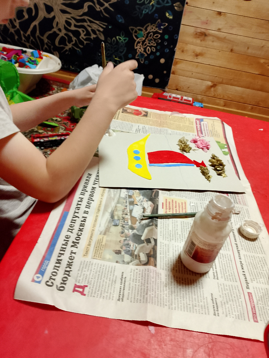 Решила я публиковать иногда наше творчество. Сегодня у нас +36, мозг плавится даже под кондиционером, поэтому я решила заняться с Ваней только творчеством. Вырезали из бумаги детали для кораблика, наметили солнце, облака и море и начали клеить. В качестве фона взяли обложку от какой-то игры, она картонная. У меня в запасах завалялась цветная калька, из которой получаются очень эффектные "мятые" аппликации. Клей у нас ПВА строительный, он при высыхании становится прозрачным. И мы используем много клея, маленькая баночка нам не подойдет. Облака сын захотел сделать золотые, солнце розовым. Море у нас разноцветное. Во-первых, так красивее, а во-вторых, на такую технику аппликации требуется много материала. Серый для неба нам не очень понравился, решили закрасить голубой гуашью. К сожалению, в формат статьи видео не загружаются, поэтому только фото. Когда такого плана работы высыхают, сын очень любит трогать рукой шершавые поверхности, они очень приятные. Люблю, когда ребёнок сам выбирает