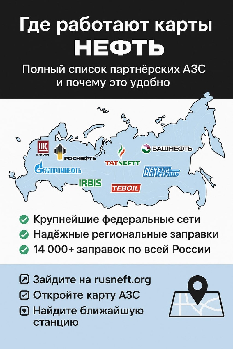 🚛 Где работают карты "НЕФТЬ"? Полный список партнёрских АЗС и почему это удобно ⛽️🗺 Вы часто спрашиваете: “А где можно заправиться с картой ‘НЕФТЬ’?” Отвечаем: везде, где удобно. Мы сотрудничаем с крупнейшими федеральными и надёжными региональными сетями. 📍 Партнёрские сети, где принимается карта "НЕФТЬ": ✅ Лукойл ✅ Роснефть ✅ Газпромнефть ✅ Татнефть ✅ Башнефть ✅ Нефтьмагистраль ✅ Трасса ✅ IRBIS ✅ TEBOIL ✅ И ещё сотни АЗС по всей России 🧭 Всего — более 14 000 заправок, от Москвы до Владивостока. 🔎 Как найти ближайшую АЗС? 📲 Зайдите на сайт rusneft.org 🗺 Откройте карту партнёрских АЗС 📍 Введите нужный регион, и сразу увидите, где можно заправиться 💡 Совет: добавьте карту на экран телефона — она работает как Яндекс.Карты, только без рекламы и "случайных" заправок. 💡 Почему это удобно: ✔️ Фиксированная цена — неважно, трасса или город ✔️ Скидки до 20% на литре ✔️ Уверенность в качестве — только проверенные сети ✔️ Без лишних чеков и бумаг — всё в личном кабинете ✔️ Ра