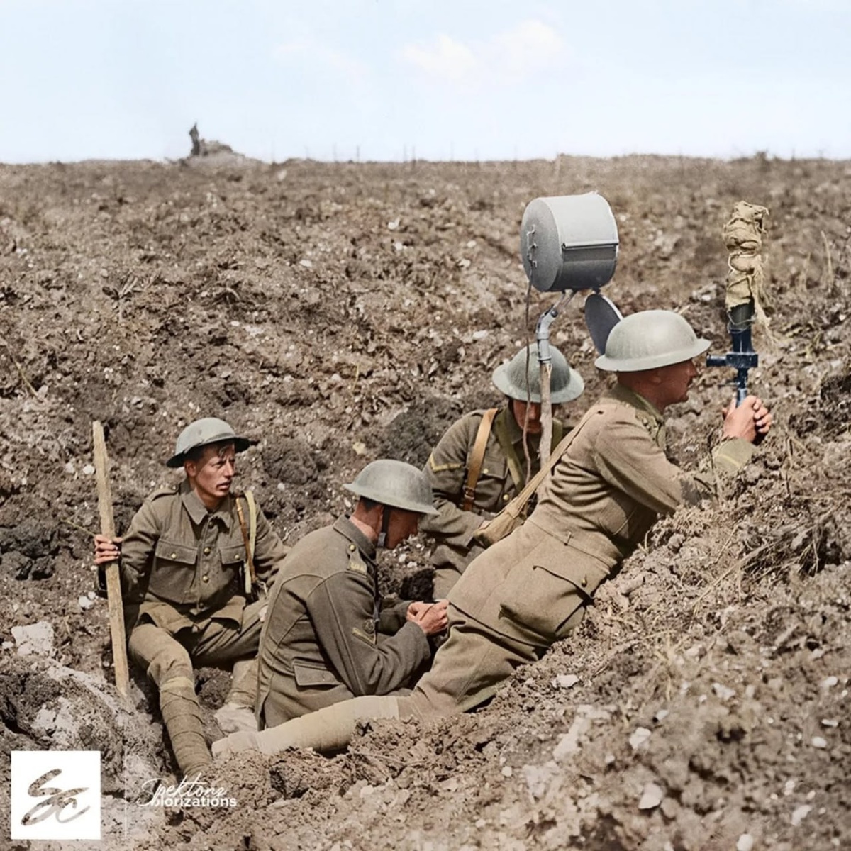 Британские солдаты в яме используют сигнальную лампу, 1916 год.
