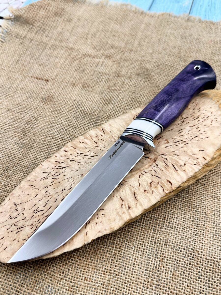 🔹Рукоять — из стабилизированной карельской берёзы (фиолетовая) в сочетании с белым акрилом. Каждый нож — настоящее произведение искусства и надёжный рабочий инструмент.