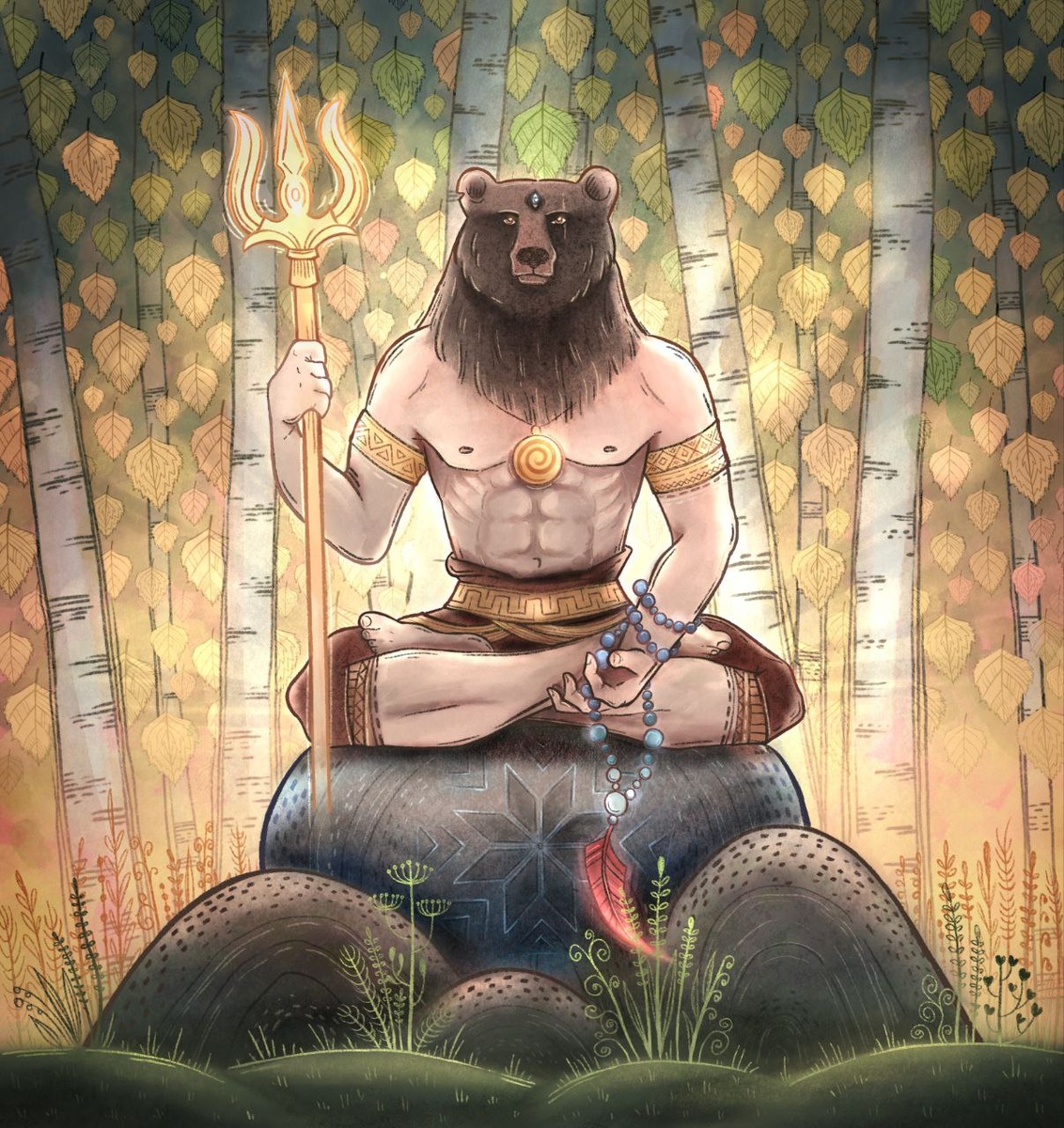 Сегодня мы хотим познакомить вас с глубоким и многослойным символом — Джамбаваном, медведем-йогином, который объединяет в себе силу индийских эпосов и сакральную мощь славянских корней. Джамбаван — одну из самых древних фигур в индуистской мифологии. Он появился из зевка Брахмы — прародителя мира, ставшим «царем медведей» на острове Джамбубхима-адипрадеша. Он участвовал в возвращении Ситы и походе Рамы на Ланку, возглавляя войско медведей. В «Махабхарате» он сразился с Кришной за магический камень Шьямантака — но, узнав в нем божество, отдал и камень, и свою дочь Джамбавати — ставшую одной из жен Кришны. Из этих историй Джамбаван предстает как демонстрация вечности, преемственности времен и глубокой мудрости: он был свидетелем смены эпох и хранителем дхармы. В славянской традиции медведь — символ силы, плодородия, глубокой духовной мудрости и связи с подземным миром. Медведь — животное Велеса, главного бога подземного царства, скота и магии. Существовал культ медведя, который почитали