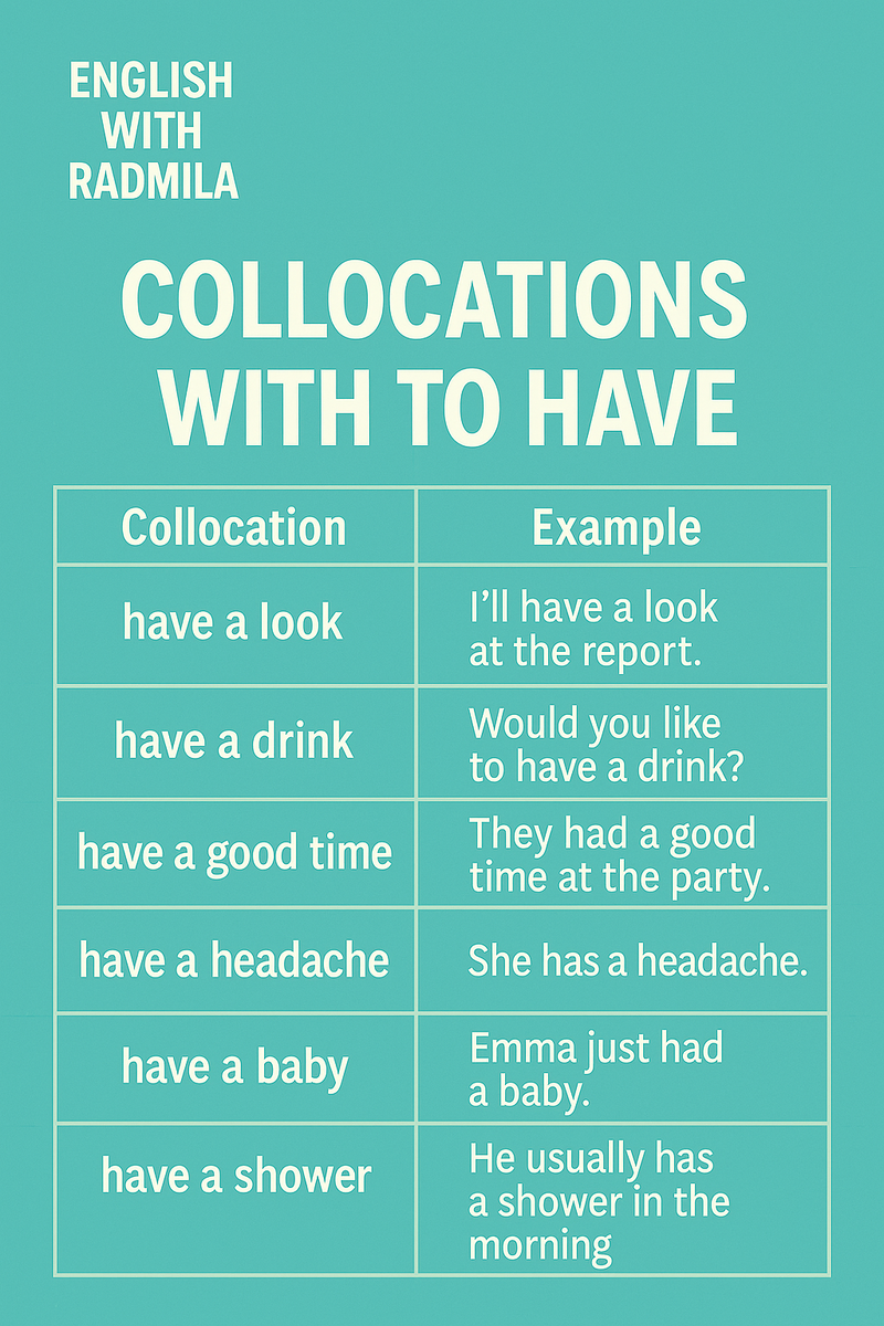 Понимание коллокаций - естественных сочетаний слов, которые звучат правильно вместе - важный навык на пути к овладению языком. Один из самых распространенных глаголов в английском языке — "to have". Он используется в различных контекстах, и знание его коллокаций значительно улучшает навыки общения. Основные коллокации В таблице представлены некоторые важные коллокации с "to have" и примеры их использования. have a look - взглянуть have a drink - выпить have a good time - хорошо провести время have a headache - иметь головную боль have a baby - родить ребенка have a shower - принять душ #ИзучениеАнглийского #ГрамматикаАнглийского #ГлаголToBe #АнглийскийДляНачинающих #репетиторпоанглийскому #английскийонлайн