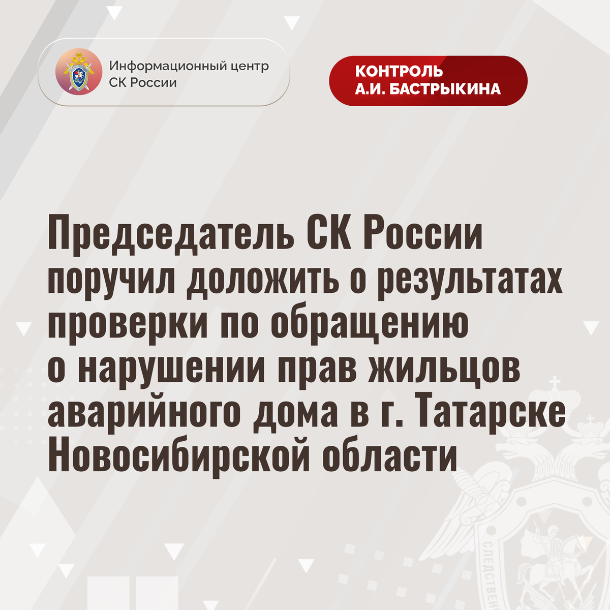 Председатель СК России поручил доложить о результатах проверки по обращению о нарушении прав жильцов аварийного дома в г. Татарске Новосибирской области В приемную Председателя СК России А.И. Бастрыкина «ВКонтакте» поступило обращение по вопросу нарушения прав жильцов многоквартирного дома по улице Линейной города Татарска Новосибирской области. Здание, 1962 года постройки, признанное аварийным пять лет назад, находится в непригодном состоянии: разрушаются несущие конструкции, напольные и потолочные перекрытия, нарушена целостность кровли, отсутствует центральное отопление. Несмотря на вступившее в прошлом году в законную силу решение суда, до настоящего времени гражданам благоустроенное жилье не предоставлено. Многочисленные обращения в компетентные органы результатов не принесли. В СУ СК России по Новосибирской области организована процессуальная проверка. Председатель Следственного комитета Российской Федерации Александр Иванович Бастрыкин поручил руководителю СУ СК России по Новоси