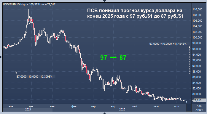 ПСБ понизил прогноз курса доллара на конец 2025 года с 97 руб./$1 до 87 руб./$1 Курс доллара к рублю расчётный, фьючерс, вечный фьючерс и межбанк. Курс евро к рублю расчётный, фьючерс, вечный фьючерс и межбанк. Курс юаня к рублю биржевой, фьючерс, вечный фьючерс и межбанк. Банк ПСБ понизил прогноз курса пары рубль/доллар на конец 2025 года с 97 руб./$1 до 87 руб./$1, говорится в комментарии аналитика Дениса Попова. По данным ЦБ, спрос юрлиц на иностранную валюту стабилизировался - в июне нетто-покупки на биржевом и внебиржевом сегментах составили $19,9 млрд, как и в мае, отмечает эксперт. Спрос физических лиц на валюту в июне заметно снизился, нетто-покупки составили $1 млрд после $1,4 млрд в мае. Чистые продажи иностранной валюты крупнейшими экспортерами незначительно выросли, но оставались вблизи минимумов за 2024-2025гг. Аналитик предполагает, что в мае-июне снизилось отношение продажи валюты крупнейшими экспортерами к объему экспортной выручки (в феврале-апреле они продавали около