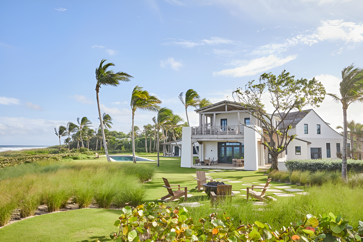 Недавно построенный основной дом площадью 835 квадратных метров (плюс гостевой дом площадью 102 квадратных метра), расположенный в северной части острова Джупитер, штат Флорида, в окружении пышной растительности, в 90 метрах от океана, должен был стать местом для отдыха и релаксации с максимальным уровнем приватности. Чтобы обеспечить тень и защиту от сильного ветра, были сконструированы наклонные крыши с изогнутыми балками, образующими величественные широкие арки. Возможность любоваться Атлантическим океаном практически из каждой комнаты сразу же стала приоритетом в проектировании и вдохновила на изменение плана здания на 45 градусов.