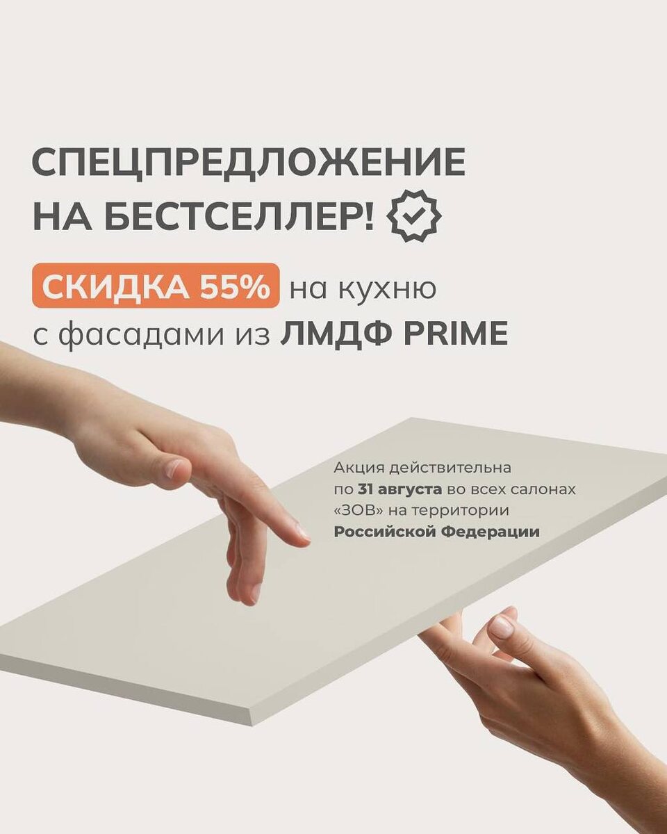Делимся с вами акцией на бестселлеры от фабрики ЗОВ🔥 Только до конца августа — скидка 55% на кухонную мебель по индивидуальному проекту с фасадами из коллекции PRIME! Фасады PRIME из МДФ с ламинированной пленкой PET обеспечивают не только стильный вид, но и долговечность. 🔸 Суперматовая поверхность устойчива к отпечаткам и мелким царапинам. 🔸 Максимальный размер фасада — 1220 × 3040 мм. Доступны скрытые ручки и витрины. Ждем вас в нашем салоне! Подписаться | Контакты | Акции #зов #кухнизов #зовмосква #зовбутово