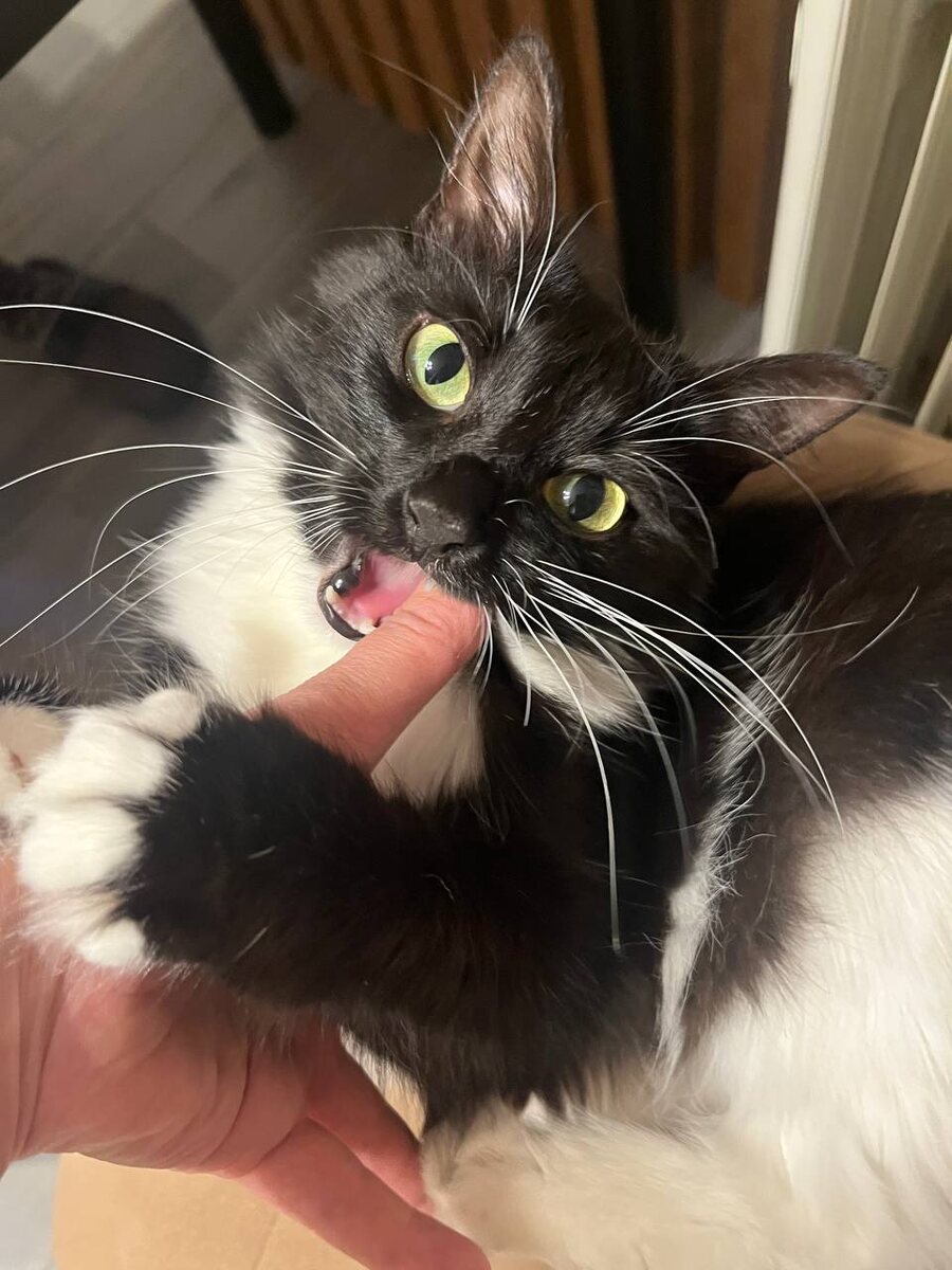 Черно-белая красотка обожает наблюдать за всем, что происходит за окном, отдыхать в раковине и на кровати, нежиться в коробках и, конечно, вместе с хозяевами болеть за любимую хоккейную команду «Трактор». А ещё у этой красотки есть собственный кошачий дом, кстати, совсем не хуже человеческого.