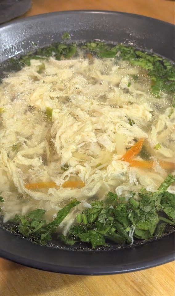 Представьте, прозрачный золотой бульон с нежными яичными «облаками», тонкими нитями вермишели и ароматом летней зелени... Ваша замороженная капсула вкуса + 3 гениальных приёма. ❄ Лайфхак века. Бульонные капсулы 1. Сварите концентрированный бульон (курица + коренья + перец горошком). 2. Остудите → снимите жир (сохраните для жарки!). 3. Разлейте в зип-пакеты порционно → заморозьте «блинами». Срок хранения: 3 месяца! Ингредиенты (на 4 порции) • Бульон — 1.5 л • Картофель — 2 шт. • Морковь — 1 шт. • Яйца — 3-4 шт. • Вермишель «паутинка» — 100 г • Смесь зелени — петрушка + укроп + зелёный лук • Чеснок — 2 зубчика (выдавить в конце) • *Лавровый лист — 2 шт. • Горошины душистого перца*— 4 шт. • Сливочное масло — 20 г (для бархатистости!) 👩🍳 Пошаговый ритуал: магия без усилий 1. Бульон + овощи: старт! - Достаньте бульонную «капсулу» → растопите в кастрюле. - Добавьте картофель кубиком + морковь соломкой. - Варите 15 мин (до мягкости картофеля). 2. Яичные «хризантемы»: фокус-покус! 1. Взбейт