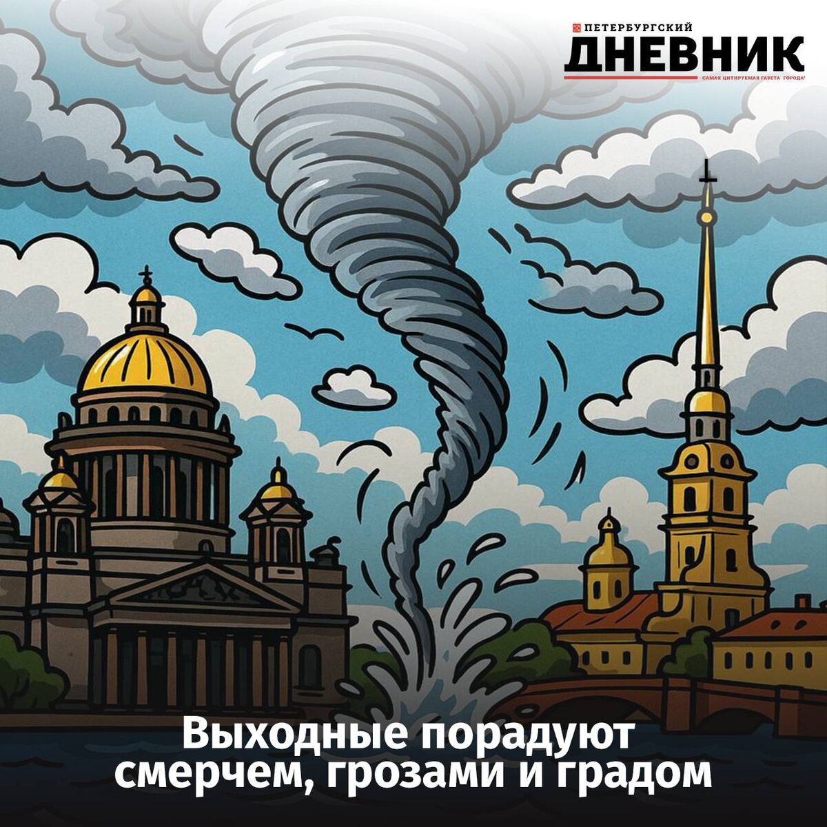 🌪 Погода шепчет: Петербург могут настигнуть летние катаклизмы Прогнозы синоптиков на ближайшие дни остаются довольно серьёзными. Вместе с долгожданной жарой в +28 и +33 градусов эксперты предрекают и образование летних конвективных явлений. ⚡️ Так, в субботу и в воскресенье в большинстве районов Петербурга и области помимо кратковременных дождей и гроз могут нагрянуть ливни, град и шквалистое усиление ветра. По югу территории Ленобласти в субботу отмечается вероятность образования смерчей. Напряжение в атмосфере начнет спадать к понедельнику — тогда температура воздуха немного спадет. Грозы и отдельные ливни ещё возможны, но опасность к этому времени уже должна миновать. Фото: DALL-E Петербургский дневник