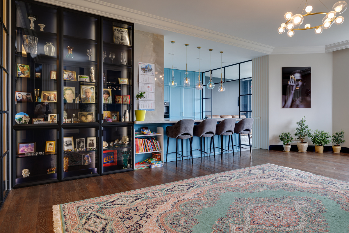В этом просторном жилище царит изысканная гармония. Современная классика, пронизанная переливами синего — от нежных теплых фонов до дерзких холодных акцентов — создает атмосферу вневременной элегантности и безупречного вкуса. Наша студия, блестяще справилась с вызовом «планировка должна остаться неизменной», и превратила каждую зону в образец функционального искусства. Уже с порога гостей встречает особый статус пространства. Удлиненная входная дверь, созданная специально для высокого хозяина, подчеркивает тон благородной сдержанности. Гостевой санузел расположен прямо у входа, но мастерски скрыт за зеркальными фасадами шкафов, оставаясь практически незаметным. Просторная душевая зона и уютная постирочная, интегрированная за фасадами, выдержаны в единой цветовой гамме, подчеркивая стилистическую целостность проекта. Зона входа мастерски разделена: практичная плиточная часть сменяется протяженным паркетным коридором. Его ритм задают подсвеченный потолок и эффектная ниша с яркими обоями