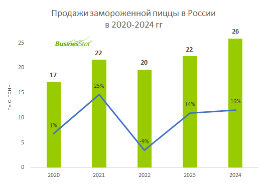 По данным «Анализа рынка замороженной пиццы в России», подготовленного BusinesStat в 2025 г, в 2024 г ее продажи в стране увеличились на 16% до 26 тыс т. При этом прирост рынка в денежном выражении был более существенным (43%): одновременно с натуральными продажами повысилась и средняя цена продукции. Это связано с увеличением отпускных цен производителей, а также с изменением потребительских предпочтений, повышением интереса к оригинальной, премиальной пицце. В рознице покупатели стали чаще приобретать продукцию по наполнению и вкусу напоминающую блюда, которые представлены в кафе, пиццериях и ресторанах. Вместе с растущим интересом потребителей к готовой еде увеличению продаж замороженной пиццы способствует и появление большого числа новинок. Производители вводят новые вкусы, рецептуры, форматы изделий. Так, помимо пиццы стандартных форм и размеров, набирают популярность римская пицца, пиццетта. В 2020-2024 гг более 75% реализации замороженной пиццы приходилось на розницу. Развитие т