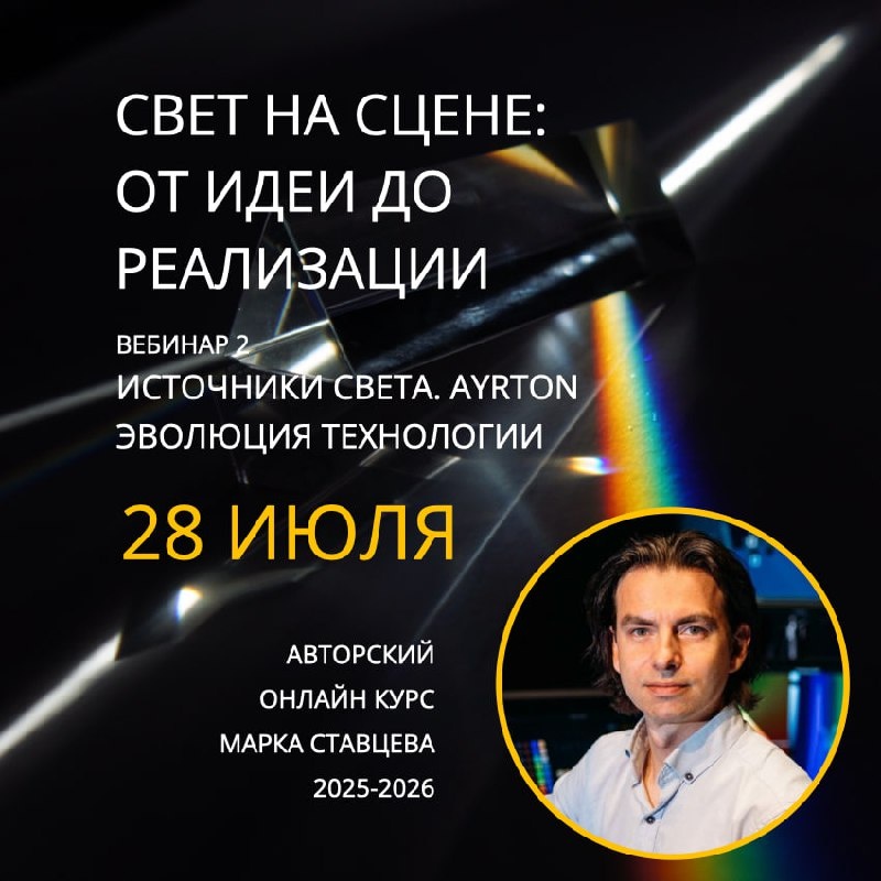 28 июля состоится второй вебинар авторского онлайн-курса Марка Ставцева «Свет на сцене: от идеи до реализации». Это практическое обучение на основе многолетнего опыта Марка как художника по свету. Напомним, курс включает 12 последовательных онлайн-занятий, которые проходят раз в месяц. Участники курса получают доступ к закрытому чату для общения, обсуждения материалов, обмена опытом и оперативной связи с преподавателем. Трансляции и записи размещаются на нашем YouTube-канале и доступны только участникам курса. На занятии 28 июля мы изучаем основные типы источников света — от классических ламп до современных LED-модулей — и учимся читать их маркировку. А в практической части разберем на примере приборов Ayrton, как светодиодные технологии стали инструментом сценического искусства. Также будет введение в ETC EOS: базовая настройка и работа с Augment3D. Приготовьте ноутбук ☝🏻 Регистрируйтесь и приходите на занятие 28 июля! Время начала для разных стран: 10:00 Москва 11:00 Дубай, Ба