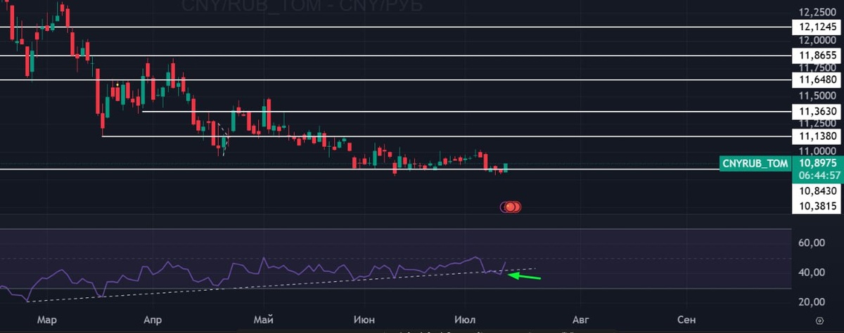 🔤 Юань-Рубль 🟢Линию по RSI удержали, вытянув сегодня валюту вверх. Но я не тороплюсь влетать, так как покупателей последние дни не было, и это вытягивание за уши может оказаться ловушкой. #юаньрубль #прогнозрубля #юань #рубльдоллар #CNY #CNYRUBF #CNYRUB #bogdanoffinvest