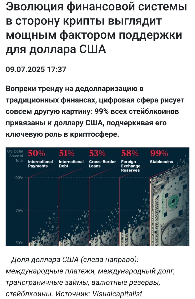 После глобального доминирования во второй половине XX века доллар США начал терять позиции. В частности, его доля в мировых резервах достигла 73% в 2001 году, после чего снизилась до текущих 58%. Схожим образом выглядят и другие показатели: доля доллара в международных платежах составляет 50%, в трансграничных займах — 53%, в нем номинированы 51% всех долговых обязательств. Здесь снижение роли американской валюты очевидно. Однако, вопреки тренду на дедолларизацию в традиционных финансах, цифровая сфера рисует совсем другую картину. Ошеломляющие 99% всех стейблкоинов привязаны к доллару США, подчеркивая его ключевую роль в криптосфере. По мере резкого роста предложения стейблкоинов, их эмитентам необходимо обеспечивать свои «монеты», покупая казначейские облигации США или другие ликвидные долларовые активы. Это создает значительный спрос на американскую валюту: примечательно, что эмитенты стейблкоинов в совокупности входят в топ-20 крупнейших держателей государственного долга США. Т