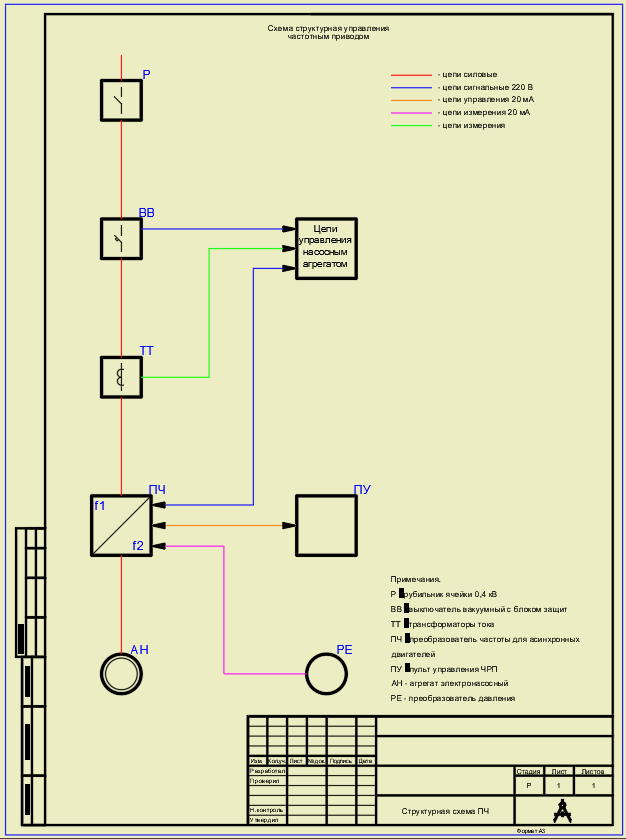 Схема структурная управления частотным приводом Технический состав схемы: Р - рубильник ячейки 0,4 кВ. ВВ - выключатель вакуумный с блоком защит. ТТ - трансформаторы тока. ПЧ - преобразователь частоты для асинхронных двигателей. ПУ - пульт управления ЧРП. АН - агрегат электронасосный. PE - преобразователь давления. Цепи представленные на схеме: - цепи силовые; - цепи сигнальные 220 В; - цепи управления 20 мА; - цепи измерения 20 мА; - цепи измерения. Формат – AutoCAD 2010. #Схема 👉 Скачать файл "Структурная схема ПЧ" – ЯндексДиск – 👇Подписчики получают больше материалов: закрытые посты, обновления каждую неделю!👇