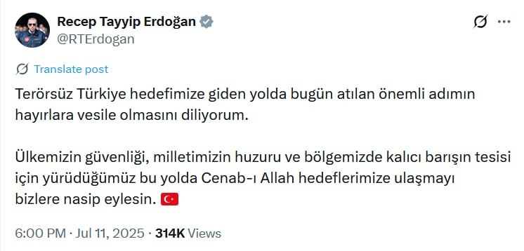 🇹🇷💬 Эрдоган сделал заявление после начала разоружения РКК