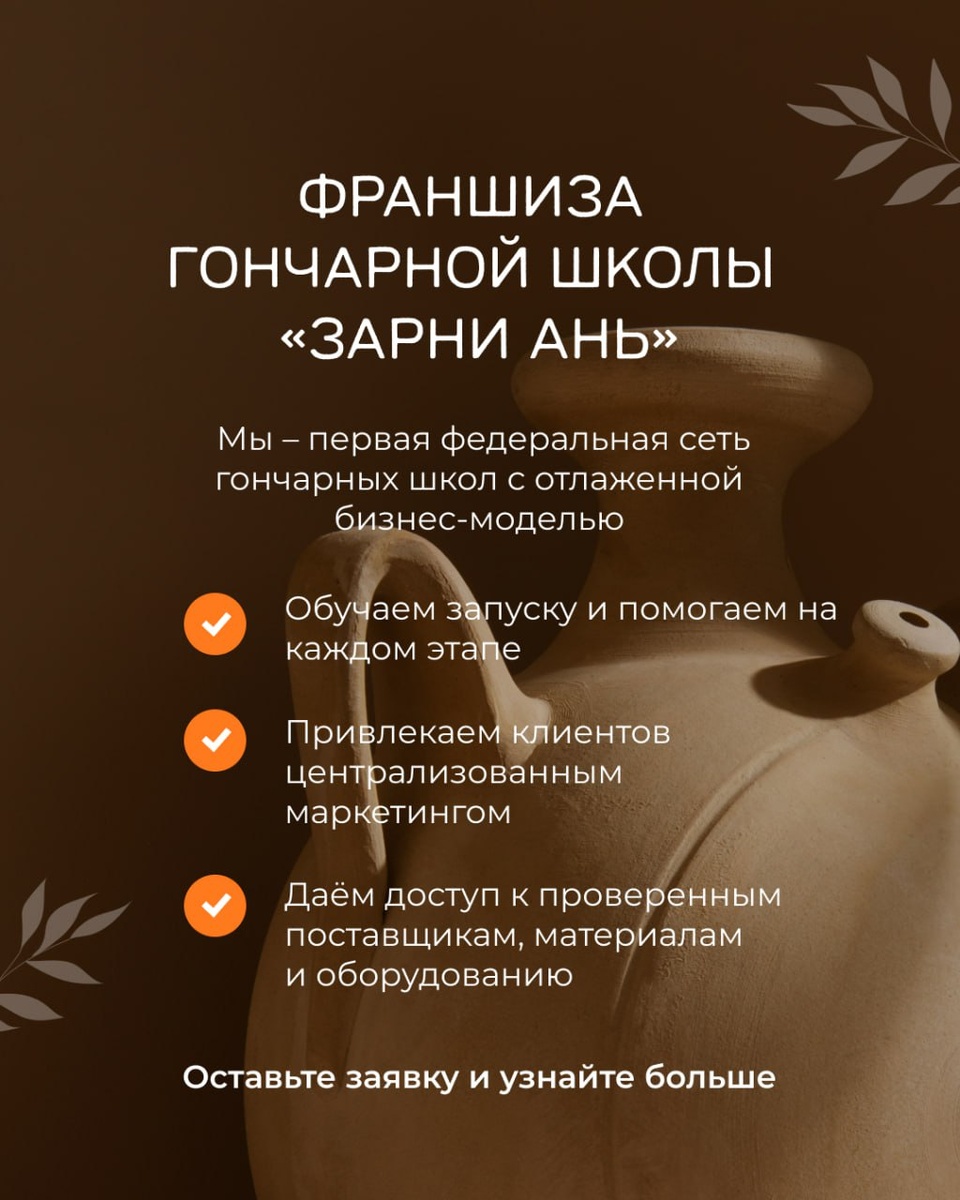 Вы мечтаете о собственном деле, которое будет не только прибыльным, но и вдохновляющим ❓ Франшиза гончарной школы «Зарни Ань» — это возможность открыть уютное творческое пространство в вашем городе и стать частью сильного бренда 🎨 🔸 Мы — первая федеральная сеть гончарных школ с отлаженной бизнес-моделью 🔸 Обучаем запуску и помогаем на каждом этапе 🔸 Привлекаем клиентов централизованным маркетингом 🔸 Поддерживаем сообществом владельцев франшиз по всей России Открывая «Зарни Ань», вы не просто строите бизнес — вы создаёте место, куда люди приходят за радостью, тишиной и теплом. 🌀 Пример базового мастер-класса: Доходы - стоимость МК 1800 ₽, пришло 8 человек, итого 14400 ₽ Расходы - ЗП преподавателю - 3600 ₽, материалы - 1500 ₽, налог 6% - 864 ₽ Чистая прибыль - 8436 ₽ ❤️ У вас нет опыта в керамике? Это не важно. Главное — желание создавать, развиваться и делиться. Всё остальное мы берём на себя 🤝 📍Оставьте заявку на сайте и узнайте больше: zarny.ru/franchise Гончарная школа