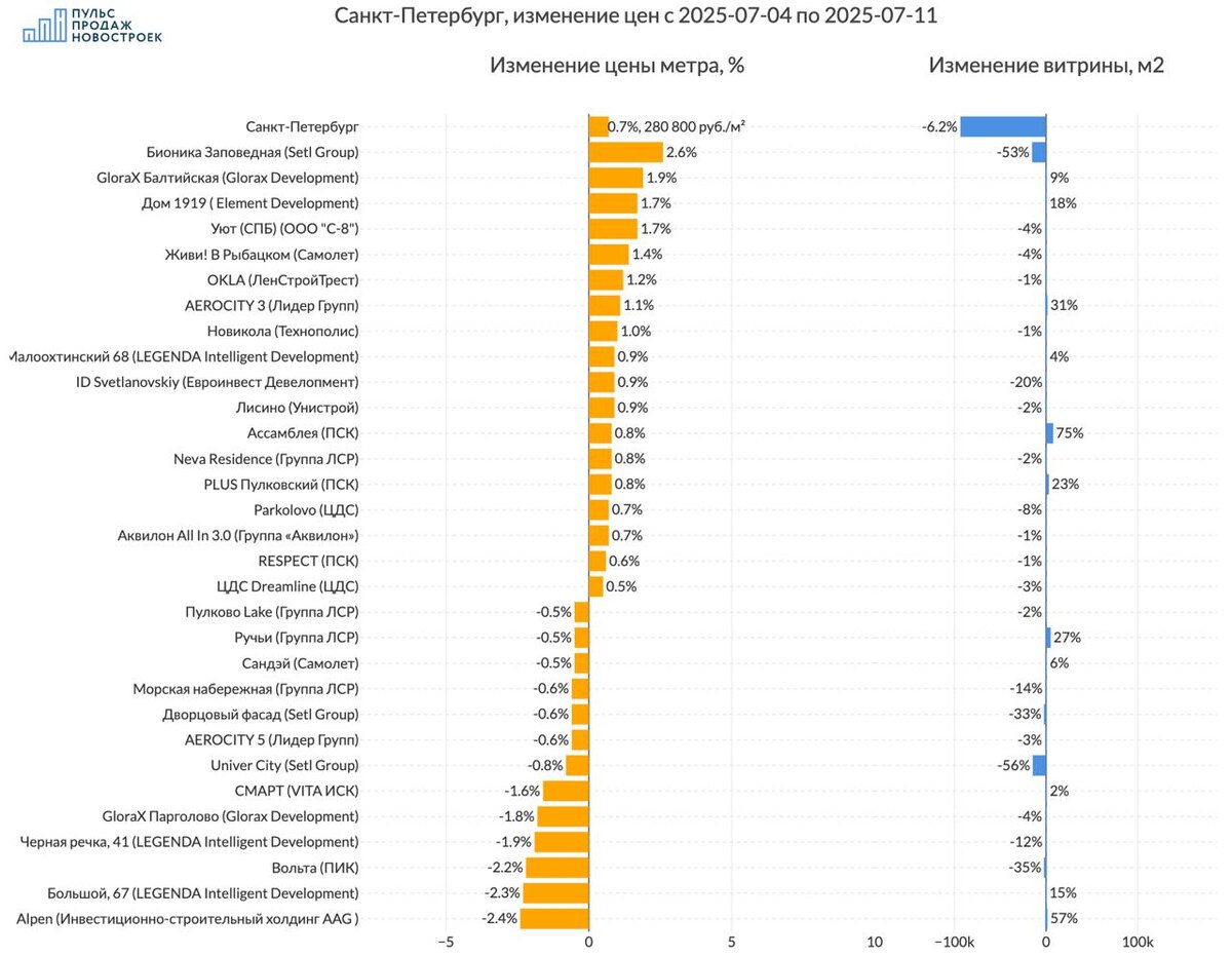 Санкт-Петербург, обзор изменения предложения на рынке за неделю💰 Смотрим без премиум и элит классов. 💵 За 7 дней цена метра выросла на 0.6% до 280 700 рублей за метр. 📈Топ изменения цен (подорожало): 1️⃣ ЖК "Бионика Заповедная" (Setl Group) цена метра +2.6%, витрина предложения уменьшилась на -15354м2 2️⃣ЖК "GloraX Балтийская" (Glorax Development) цена метра +1.9%, объем витрины при этом увеличился на 69м2 3️⃣ЖК "Дом 1919" (Element Development) цена метра +1.7%, объем витрины увеличился на 180м2 ЖК "Уют (СПБ)" (ООО "С-8") цена метра +1.7%, витрина предложения уменьшилась на -86м2 🪫Анти топ (подешевело): 1️⃣ЖК "Alpen" (Инвестиционно-строительный холдинг AAG ) -2.4% в цене, объем витрины при этом увеличился на 631м2 2️⃣ЖК "Большой, 67" (LEGENDA Intelligent Development) -2.3% в цене, объем витрины при этом увеличился на 95м2 3️⃣ЖК "Вольта" (ПИК) -2.2% в цене, витрина предложения уменьшилась на -1151м2 ☄️Объем предложения жилья в регионе ниже -6.1% (-92039 м2) Все изменения в р