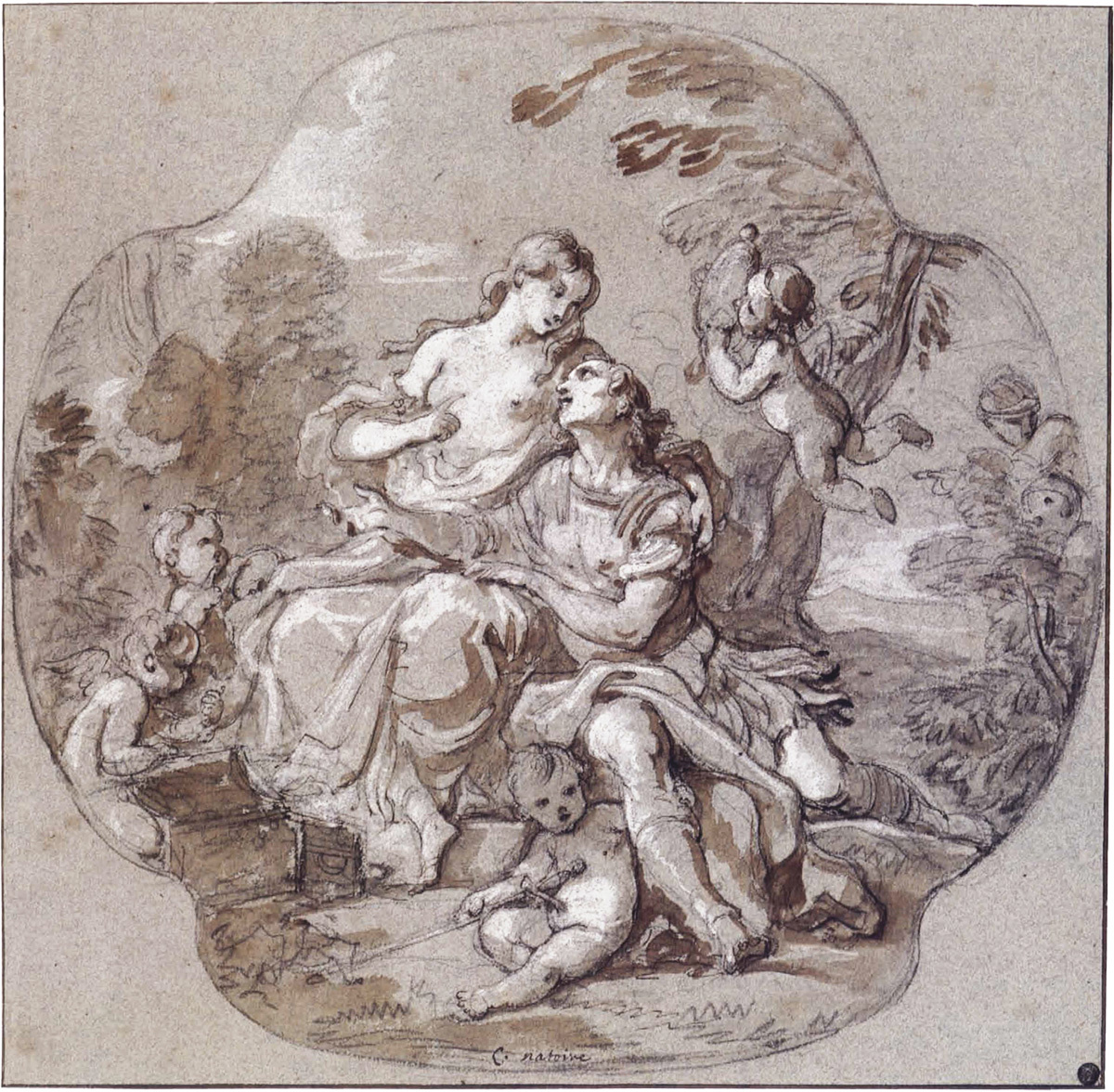 История любви христианского рыцаря Ринальдо и языческой волшебницы Армиды стала наиболее часто иллюстрируемым эпизодом «Освобождённого Иерусалима» (1581), эпической поэмы Торквато Тассо о христианском крестовом походе за освобождение Иерусалима от сарацинов в 1599 году. В то время как темой Тассо было торжество нравственного долга над физическим искушением, французские художники XVIII века предпочитали изображать момент сладострастного наслаждения перед неизбежным прощанием. Историк искусства Аластер Лэйнг предположил, что популярность этого сюжета во французском искусстве рококо может быть в немалой степени обусловлена успехом оперы «Армида» Жана-Батиста Люлли, которая с момента первой постановки в 1686 году по 1761 год возрождалась восемь раз, включая постановки в 1746 и 1747 годах. Трактовка сюжета Шарлем-Жозефом Натуаром (1700-1777) на рассматриваемом рисунке раскрывает суть истории. Ринальдо сидит в волшебном саду, его оружие лежит рядом. Он заворожённо смотрит в глаза колдун