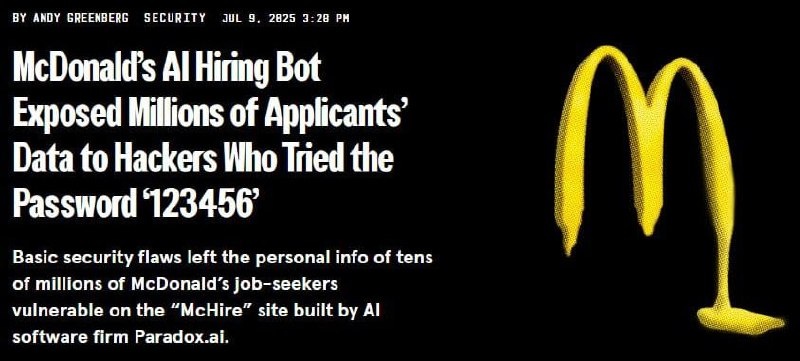 Тем временем, эксперты, в США скандал: взломан чат-бот McDonald's, собиравший персональные данные соискателей. Оказалось, что их защитили паролем «123456»