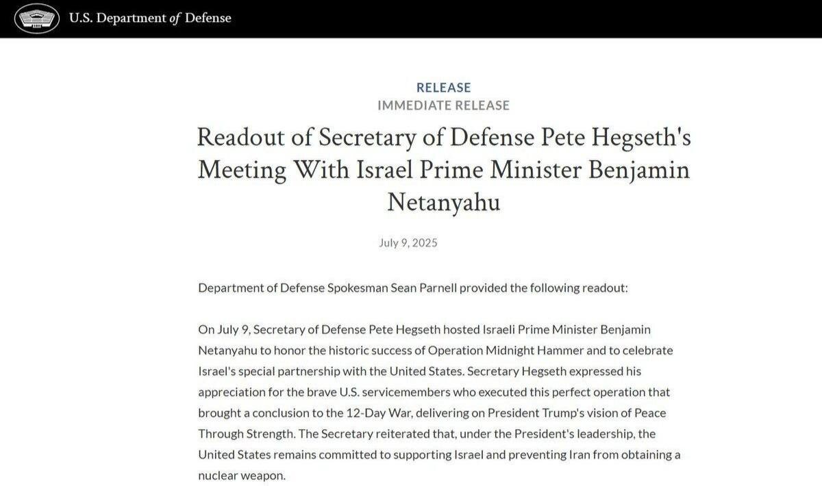 9 июля министр обороны Пит Хегсет принял премьер-министра Израиля Биньямина Нетаньяху, чтобы отметить исторический успех операции «Полуночный молот» и отпраздновать особое партнерство между Израилем и США. Министр обороны Хегсет выразил признательность храбрым американским солдатам, которые провели безупречную операцию, завершившую 12-дневную войну и воплотившую в жизнь видение президента Трампа о мире через силу. Министр обороны вновь подчеркнул, что под руководством президента Соединённые Штаты остаются приверженными поддержке Израиля и предотвращению получения Ираном ядерного оружия.
