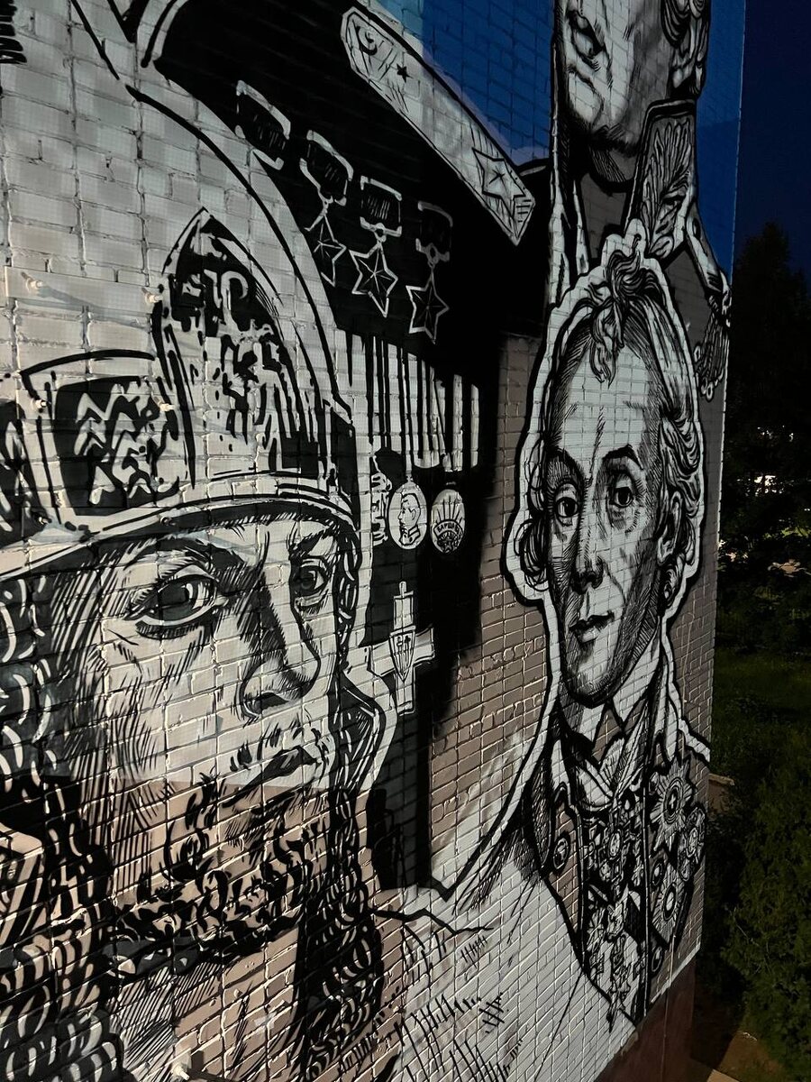 Известный в Марий Эл художник Илья Белов показал результат своей новой работы – граффити на школе №3 в пгт Медведево Новое граффити Илья назвал «Лица героев». На нем изображены Александр Суворов, Михаил Кутузов, Александр Невский и Георгий Жуков. «Думал, это будет быстрый фасад – рассчитывал потратить 3 дня с учётом грунтования и выкрашивания его фасадкой. Расчёт был такой: день на подготовку, один на покраску с ночной разметкой, а следующий день на подправку линий и доделки. В реальности, когда я столкнулся с разметкой, понял: за одну ночь точно не размечусь один. Да и на правки потом ушёл целый день. На работу в итоге потратил шесть рабочих дней», – рассказал Илья. Сложности возникли с прорисовкой Георгиевской ленты: толщину ее линий художник измерял с помощью рулетки, и из-за выступов кирпичей и особенностей кладки сделать симметричные ровные линии оказалось непросто. В своем Telegram-канале Илья написал, что на дает на свою новую работу гарантию два года.