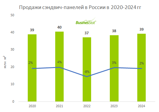В 2024 г продажи сэндвич-панелей в России выросли на 2% и составили 39 млн м².