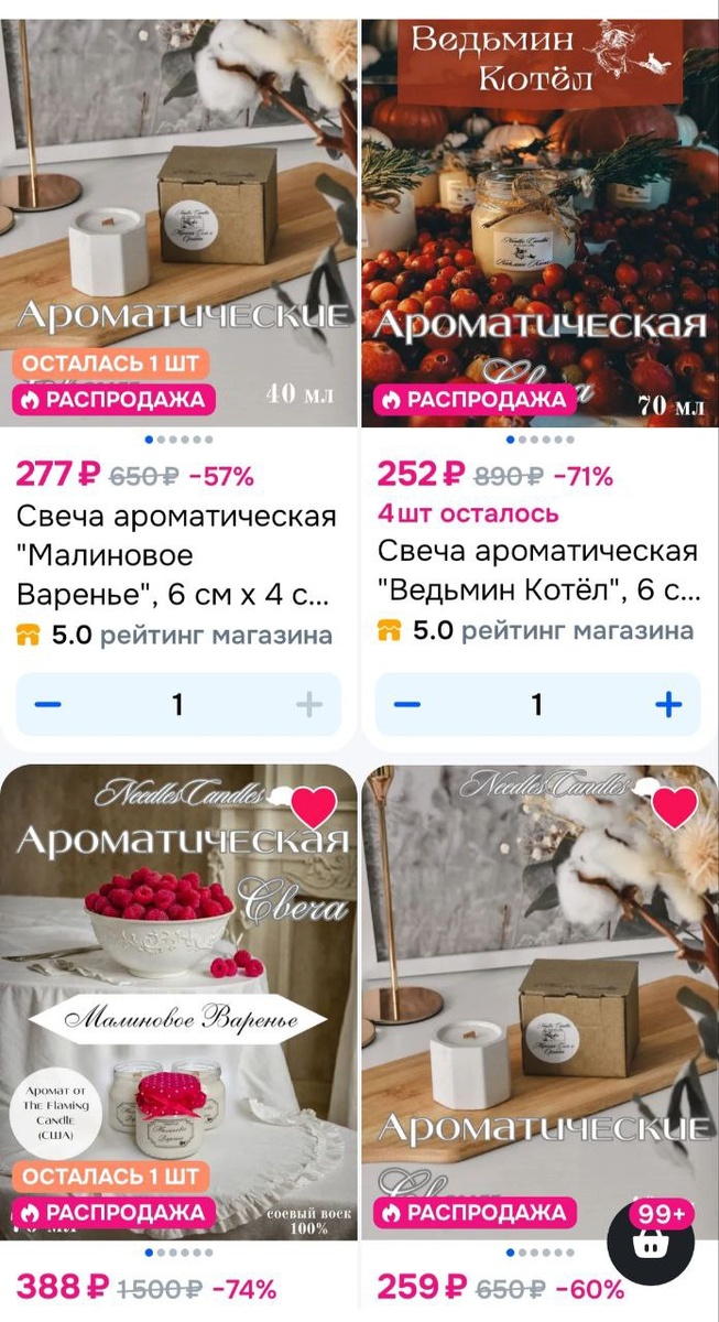 Летняя распродажа🛍️ В нашем магазине ️https://ozon.ru/t/unVnyYa товары участвуют в акциях и цены МАКСИМАЛЬНО низкие! Успейте приобрести наши свечи по выгодным ценам с удобной доставкой!🕯️ Дарите тепло себе и близким! ❤️🔥 🎁при оформлении заказа на OZON напишите нам! Мы расскажем как получить подарок 😉 Если не нашли желаемое на OZON, мы всегда готовы изготовить товары индивидуально для Вас! 🔸 👇по всем вопросам пишите✨ http://t.me/NeedlesCandlesAnswers