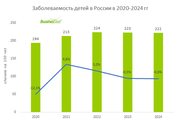 По данным «Анализа рынка педиатрии в России», подготовленного BusinesStat в 2025г, в 2024 г заболеваемость детей в стране достигла 222 случаев на 100 человек, вернувшись к допандемийным показателям. В среднем на каждого ребенка в возрасте до 17 лет приходится 2,2 случая заболеваний за год. В 2020 г из-за снижения доступности плановой медпомощи на фоне пандемии выявляемость заболеваний у детей составила всего 194 случая на 100 чел. Основной рост детской заболеваемости пришелся на 2021 г (показатель увеличился до 213 случаев на 100 человек), как результат ослабления карантинных мер и реализации отложенного спроса на медицинские услуги. В 2022 г рост продолжился – заболеваемость увеличилась еще на 5%, достигнув 224 случая на 100 детей. Основной вклад внесли болезни органов дыхания, которые составляют более половины всех детских заболеваний. Среди факторов, повлиявших на рост заболеваемости, были волны Covid-19 (штамм «Омикрон»), резкие погодные изменения, увеличение концентрации аллергено