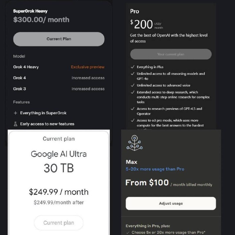 Цены на подписки AI взлетают в стратосферу! 🚀 Вот только взгляните: ▪️ "SuperGrok Heavy" — $300/мес. ▪️ "Gemini Ultra" — $249.99/мес. ▪️ "Claude Max 20x" — $200/мес. ▪️ "ChatGPT Pro" — $200/мес. ▪️ "Perplexity Max" — $200/мес. С такими ценниками ИИ-платформы будто создают "новую цифровую касту". Привилегии, доступ к мощным инструментам, уникальные возможности… и всё это только для тех, кто может себе позволить такую роскошь. А что будет дальше? Отдельная реальность для избранных? Или нас ждут более доступные альтернативы? Пишите, как вы думаете! 💬 #искусственныйинтеллект #нейросети #технологиибудущего #цифроваяреволюция #AI https://tsss.me/eMvPZ7JV