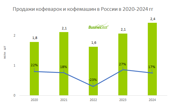 В 2024 г продажи кофеварок и кофемашин в России увеличились на 17% до 2,4 млн шт.