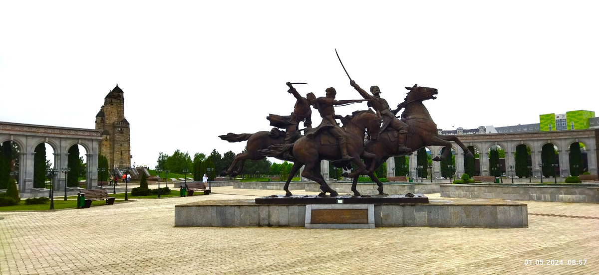 Когда в 2024 году я ездила из Кисловодска на однодневную экскурсию в Грозный, то по дороге мы проезжали по Республике Ингушетия. В программе было посещение Мемориала памяти и славы, который располагается в городе Назрань. Этот комплекс – главная достопримечательность Республики Ингушетия, посвящен важным памятным датам, событиям и трагической истории народа Ингушетии. Строить Мемориал начали в 1996 году, а официально открыли в июне 2012 года, к 20-летию образования Республики Ингушетии. Комплекс состоит из нескольких объектов, каждый посвящен какому-нибудь историческому событию. Занимает немаленькую территорию в четыре гектара, на которой разбиты аллеи, есть такие сооружения, как колоннады, памятники, арки, фонтаны, барельефы и пр. Полукругом установлены колоннады. По одной стороне 18 мемориальных плит с именами 36 ингушей, которые в период службы в российской императорской армии имели государственные награды. Вдоль другой колоннады – 18 плит, на которых высечены имена 36 деятелей, про