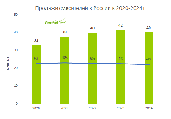 По данным «Анализа рынка смесителей в России», подготовленного BusinesStat в 2025 г, в 2024 г их продажи в стране сократились на 4% и составили 38 млн шт. Смесители импортного производства составляют более 90% ассортимента продукции на внутреннем рынке. В 2024 г Правительством РФ был принят закон об обязательном декларировании соответствия смесителей, в связи с чем многие импортеры снизили поставки продукции. Нестабильность курсов валют и рост ключевой ставки ЦБ РФ также ограничивали рынок смесителей в России. В результате в 2024 г поставки смесителей в Россию сократились на 7%, что незамедлительно отразилось на динамике внутренних продаж. При этом на протяжении последних лет, предшествующих 2024 г, продажи смесителей в России ежегодно росли на фоне увеличения объема ввода в эксплуатацию новых зданий и количества выданных льготных ипотечных кредитов, которые стимулировали спрос в отраслях, смежных со строительством. Полный обзор рынка на РБК: https://marketing.rbc.ru/research/27890/ По