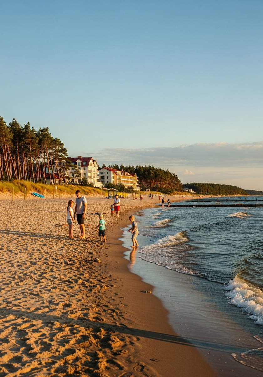 Поселок окружен сосновым парком и располагает длинным променадом для прогулок вдоль моря. Температура воды летом достигает +20 градусов, а пологий вход в воду делает пляж идеальным для семейного отдыха. В водорослях на берегу можно найти кусочки янтаря. Отель предлагает уютные номера и качественный сервис в спокойной атмосфере.