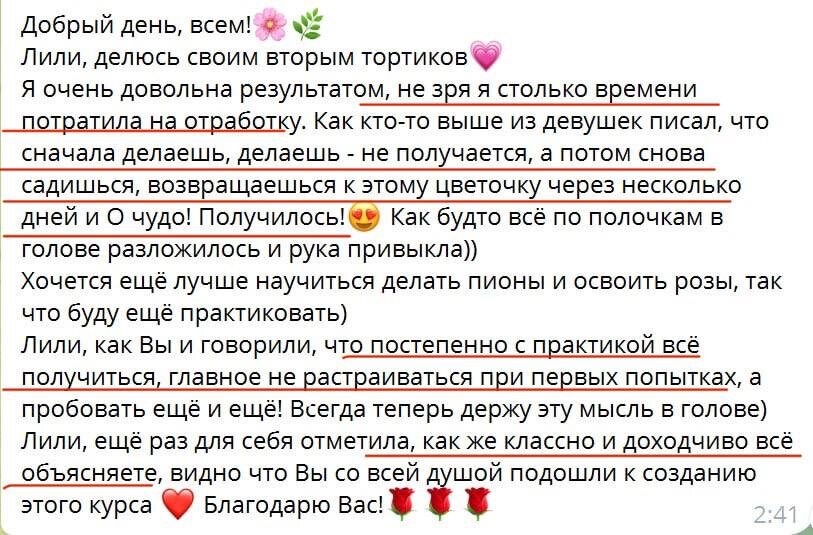 Как и обещала, делюсь с тобой с самыми распространенными установками, которые мешают тебе работать в кремовой флористике и стать востребованным кондитером Но есть хорошая новость! Сегодня раз и навсегда избавишься от этих установок и выдохнешь! Почти каждая моя ученица заходила на курс со словами "очень хочу научиться, но мне кажется, у меня руки растут не из того места". Я могу понять это сомнение, потому что техника выглядит роскошной и уникальной, из-за этого кажется, что техника сложная и не всем доступна. НО! Не получается только у тех, кто НИЧЕГО НЕ ДЕЛАЕТ, не хочет стараться и сразу опускает руки - ты относишься к таким людям? Уверена, что нет Я могу сто раз говорить о том, что 50% успеха - твои старания и практика, 50% - правильное объяснение техники и подробный курс (это я гарантирую, ВСЕ мои ученицы пишут, что я объясняю очень подробно и даю максимальную обратную связь) Но я лучше покажу отзыв моей ученицы, которая научилась делать потрясающие торты, потому что не сдавала